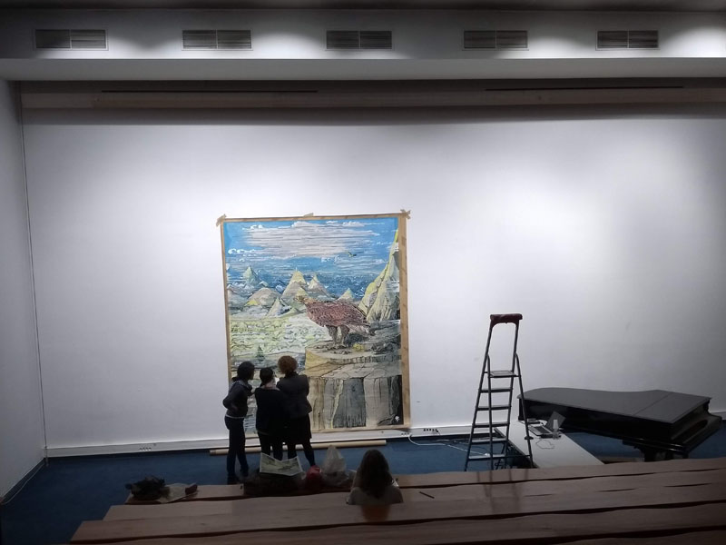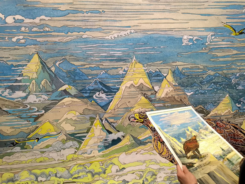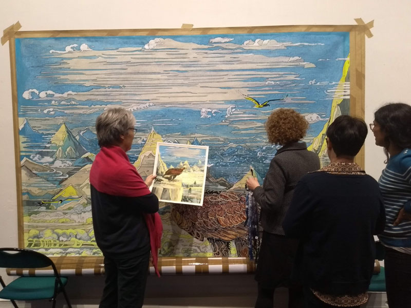 Delphine Mangeret, peintre cartonnière a terminé le carton tiré de l’aquarelle de Tolkien avec l’équipe des trois lissières à l’auditorium de la Cité internationale de la Tapisserie d’Aubusson. C’est l’atelier Francoise Vernaudon qui a obtenu l’offre de tissage avec Natalie Mouveroux de l’atelier de la Chandouille et Anne Boissau de l’atelier AnnKiTiss.