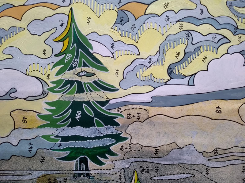 « Tolkien illustre ici les Monts Brumeux : les montagnes, belles mais menaçantes par leurs sommets déchiquetés couverts de neige, s’étendent de chaîne en chaîne jusqu’à l’horizon ténébreux. L’auteur minore le froid de ces lieux, et peut-être apporte un brin d’espoir à la quête de Bilbo en semant dans le paysage des courants jaunes de chaleur et en dissipant les ombres. Il est étonnant d’ailleurs de voir le hobbit chaussé de bottes noires, dont on ne mentionne jamais l’achat, alors qu’en véritable hobbit, il devrait aller pieds-nus.