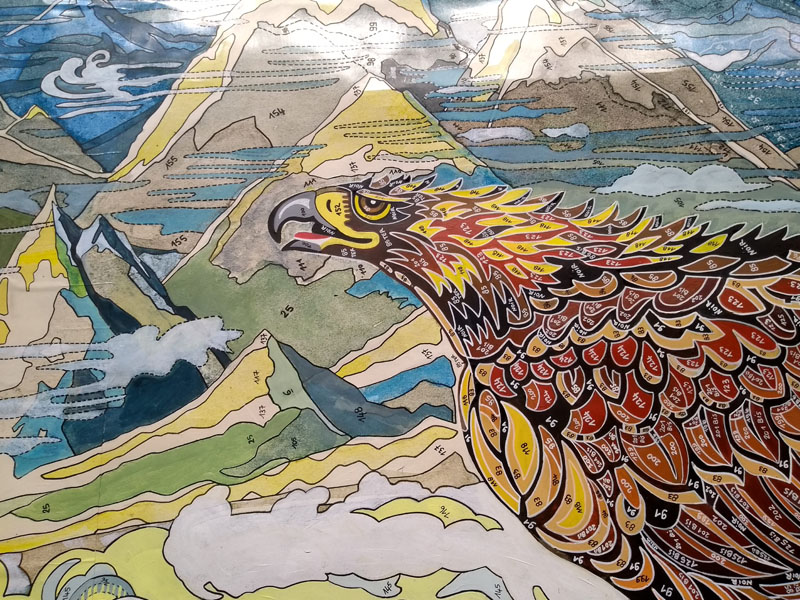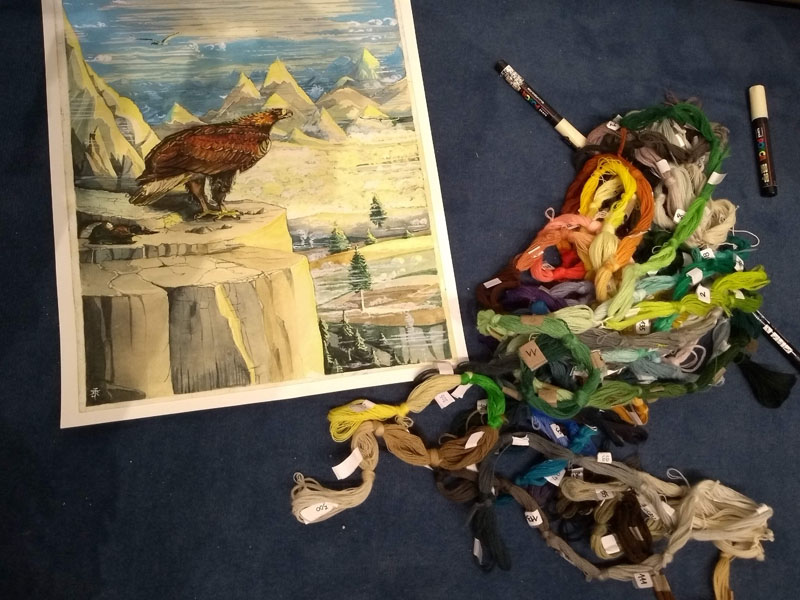 « Le rapace est repris d’une chromolithographie d’Alexandre Thornburn représentant un aigle doré adolescent, tirée des Oiseaux des îles britanniques et leurs œufs, de T. A. Coward (première série, première édition, 1919) : Tolkien adapte l’illustration de départ en stylisant les plumes et en renforçant les couleurs. » (extrait du site de la Cité internationale de la Tapisserie d’Aubusson.)