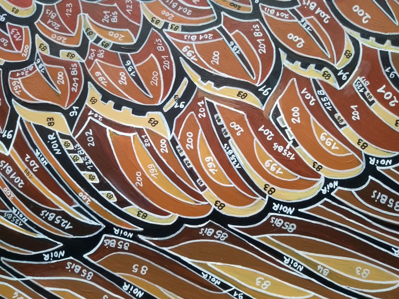 Il s’agissait de confectionner le chapelet en même temps que de numéroter le carton. Celui-ci est à grandeur réelle, et inversé, selon la tradition du tissage d’Aubusson.