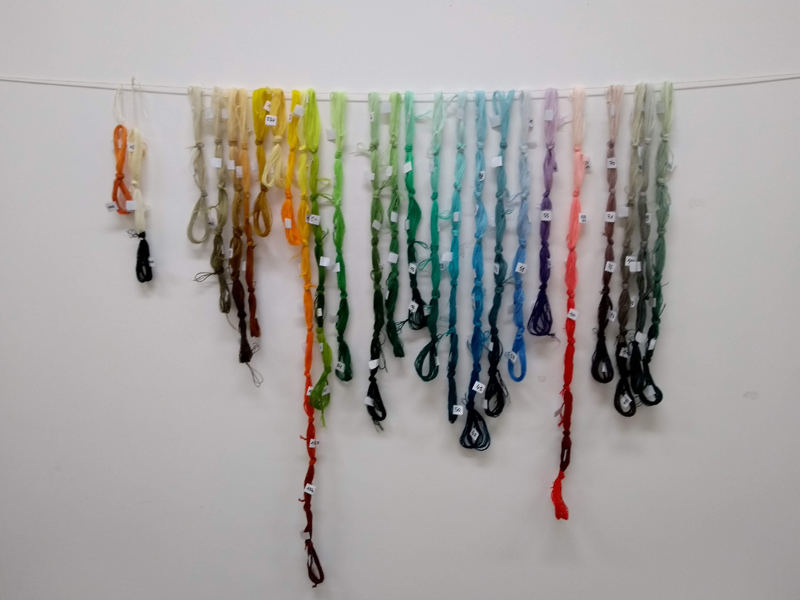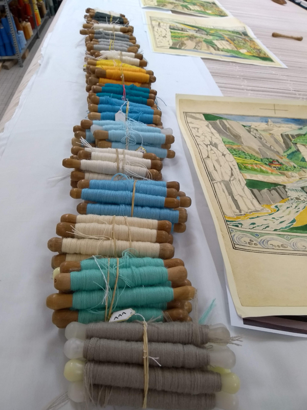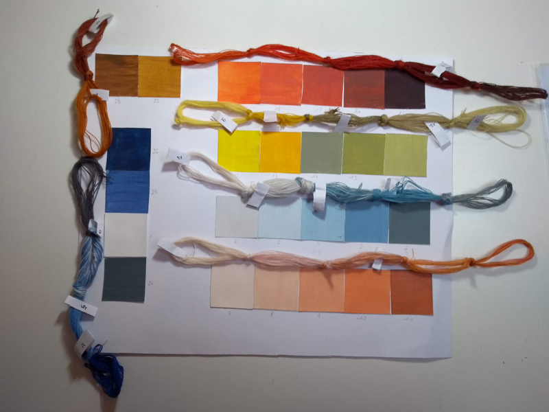 4- J’élabore un carton numéroté (modèle), j’établis un nuancier et je choisis les couleurs et les matières en confectionnant le chapelet (échantillon coloré des fils). Je tisse des échantillons. Je bobine les fils et prépare les flûtes à tisser.